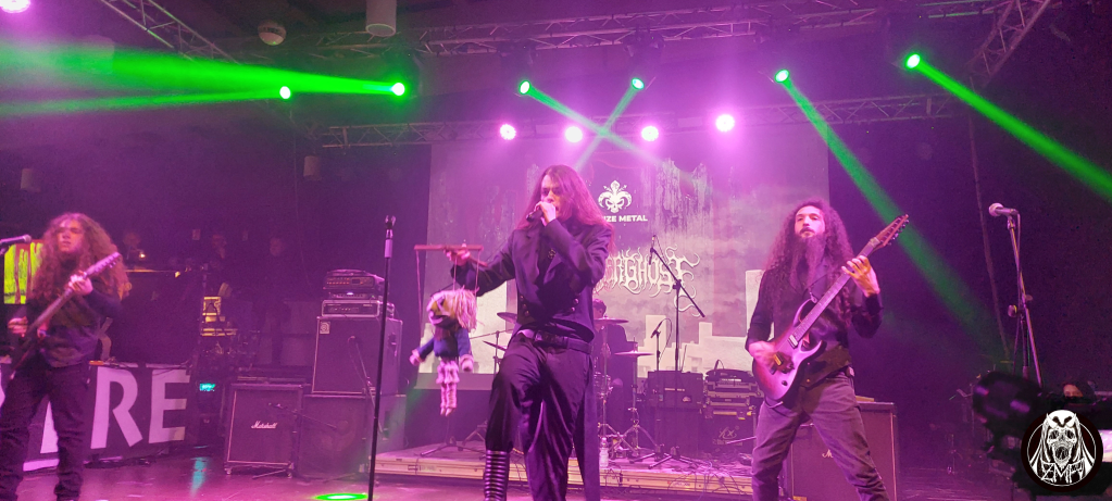 La partenza è prevista per le 19, ma tra i soliti preparativi, slitta di 45 minuti. Dopo lunghi soundcheck e verifiche tecniche, arrivano sul palco i Sinister Ghost che, freschi del loro ultimo album What’s Left of Human?, aprono la serata con una setlist che si concentra proprio sulla nuova release. I viareggini, dal sound a metà strada tra black, death e gothic, si ispirano apertamente ai Carach Angren che, come risaputo, hanno una presenza scenica che pochi altri possono vantare. E sulle stesse orme si muovono anche loro, in particolare il frontman Asmort, che sembra la reincarnazione di Seregor per il suo appeal vampiresco ma, soprattutto, per la sua presa sul pubblico. Memorabile il segmento a metà dello spettacolo, quando prende una copia della Bibbia e chiede alla folla: “Voi sapete cos’è? Per caso si mangia?”, masticando prima una pagina staccata a caso, poi riducendo l’intero libro a brandelli e lanciandone i resti sul parterre come coriandoli. Lo show prosegue senza intoppi, con Aelodh, Synugoth e Pontius che viaggiano spediti e compatti per dare supporto al loro singer, abile nel passare facilmente dal growl allo scream più vicino al black. L’esibizione dura poco, ma è convincente, con anche la presenza di Danny Metal come ospite, da parte di ragazzi giovani che hanno tutte le carte in regola per arrivare molto lontano.