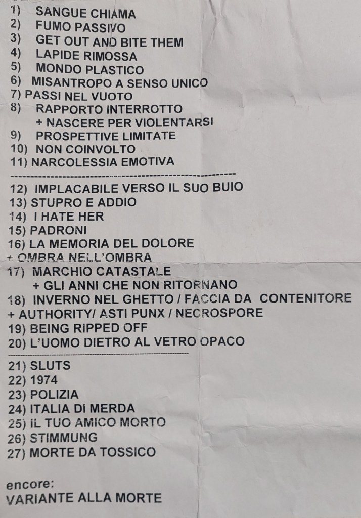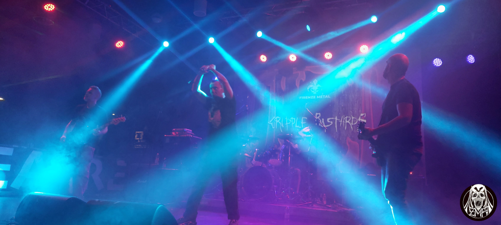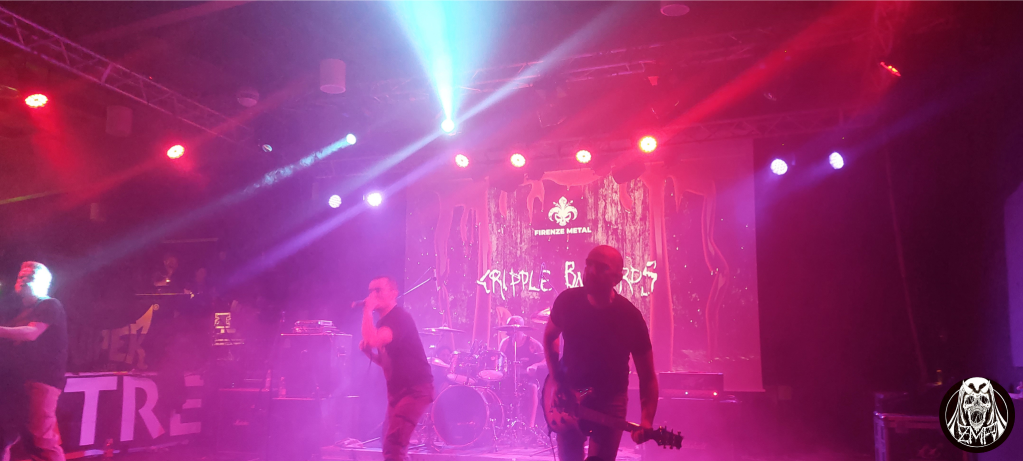 Siamo arrivati a mezzanotte, orario in cui, in teoria, la serata sarebbe terminata. E invece no, siamo ancora qui, perché manca ancora un’ultima band, quella che ci deve rifilare le mazzate finali per chiudere in bellezza. I Cripple Bastards salgono sul palco del Firenze Metal da headliner dopo aver festeggiato i 35 anni di una carriera ricca di lavori in studio, split album e numerosi tour in giro per il mondo e, dopo un lungo soundcheck, partono subito all’impazzata. I brani vengono sparati uno dopo l’altro con brutalità, senza pause, badando solo alla violenza delle loro bordate quali Fumo passivo, Sangue chiama e Misantropo a senso unico, tra le hit classiche. Der Kommisar e Schintu suonano composti e totalmente concentrati, mentre Giulio, con lo sguardo fermo e rabbioso, scarica sulla folla un growl gutturale alternato con i classici screaming taglienti 100% grindcore. E anche Raphael Saini alla batteria non scherza, picchiando con una velocità fulminante che non permette a nessuno di rifiatare. Il moshpit non si ferma mai, in molti arrivano sotto il palco trasportati dalle spinte e, dopo le tre hit Polizia, una razza da estinguere, Italia di merda e Morte da tossico, l’esibizione sembra finita. “Ciao a tutti, grazie”, dice improvvisamente Giulio, lasciando la folla un po’ disorientata, ma poi interviene Saini che, chiedendo a tutti se vogliono ancora un altro brano, convince il resto della band a suonare l’ultima Variante alla morte, chiudendo uno show di fuoco e fiamme.