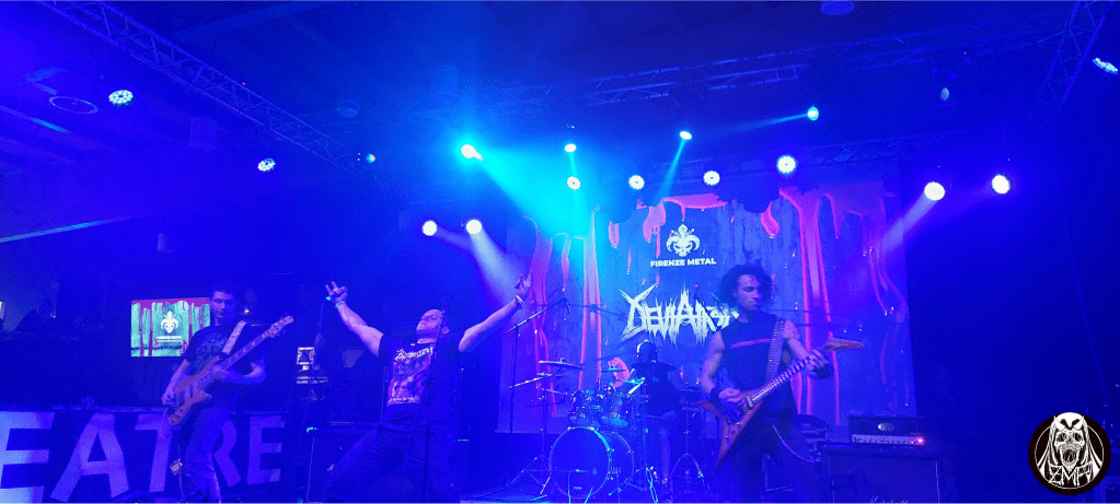 Dopo la consueta pausa, tocca ai Deviation prendersi la scena. Sarà anche una band molto recente, ma i nomi di chi ne fa parte non sono per niente nuovi, specialmente a livello locale. I componenti provengono tutti dai Suicidal Causticity e dai Disboskator, rispettivamente brutal death e thrash, che possono vantare tour e collaborazioni con grandi acts quali Incantation e Subhuman. Ad oggi, i fiorentini hanno prodotto solo un EP omonimo, dal sound esattamente a metà tra le band di provenienza, e non sono più nella pelle per suonarlo davanti ad un pubblico sempre più numeroso. Nikolas “Gorgo” Bruni si dimostra un ottimo performer con il suo potente growl, mentre il bassista Filippo Mannini e il chitarrista Davide Puliti si destreggiano alle grande, sostenuti dalla batteria di Thomas Passanisi. La folla risponde con moshpit, urla e continui incitamenti fino alla fine dello show, orchestrato perfettamente da performer esperti che sanno bene come far scatenare il panico.