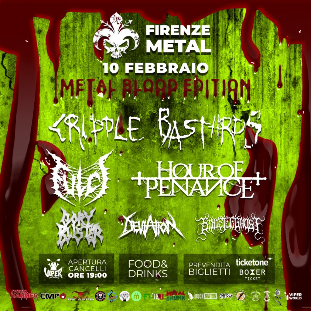 Altro giro, altra corsa. Il Firenze Metal, da quando esiste, non si ferma mai, andando avanti in edizioni sempre più spettacolari e adrenaliniche con il meglio della scena metal italiana. La volta scorsa la line-up era folta (8 band) e comprendeva quasi tutti i sottogeneri del metal, vedendo tra i protagonisti i Mortuary Drape, i Frozen Crown, gli Slug Gore e i Game Over. Lo staff e gli organizzatori avevano già in mente la prossima mossa, quella che, dopo tre mesi, si sarebbe concretizzata in uno degli eventi di punta di febbraio. E, dopo sole due settimane, l’arcano segreto venne svelato: le band tornano ad essere 6, provenienti da ogni parte della penisola, in una kermesse dominata dal death metal. In partenza troviamo i Sinister Ghost, a cui seguono i casalinghi Deviation, gli storici Gory Blister, due giganti della nostra scena death, gli Hour of Penance e i Fulci, e, dulcis in fundo, l’istituzione del grindcore italiano: i Cripple Bastards. Non serve aggiungere altro ad una line-up che si descrive già da sola. C’è solo da rispettare due imperativi: essere al Viper Theatre e assistere ad uno spettacolo che si prospetta intenso e sfrenato dall’inizio alla fine. Il pubblico non se lo fa ripetere due volte, la fila per entrare nel locale è sempre più lunga e, già prima dell’inizio, l’hype è alle stelle.