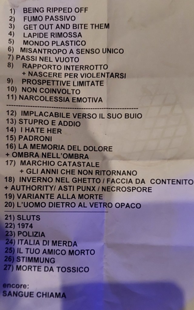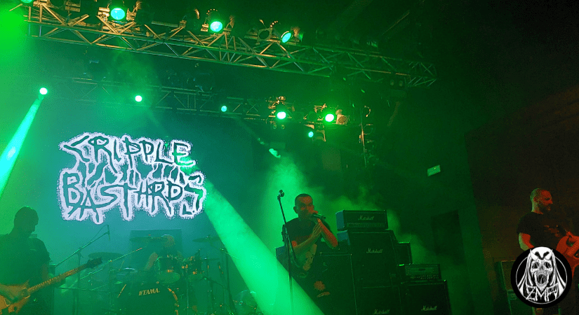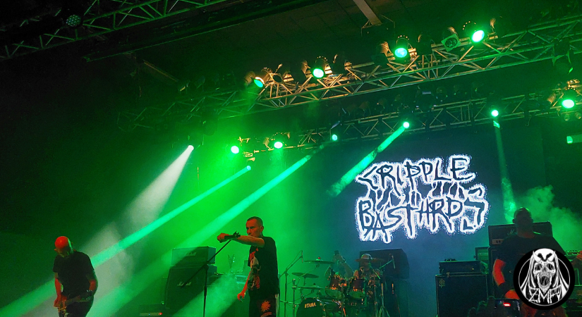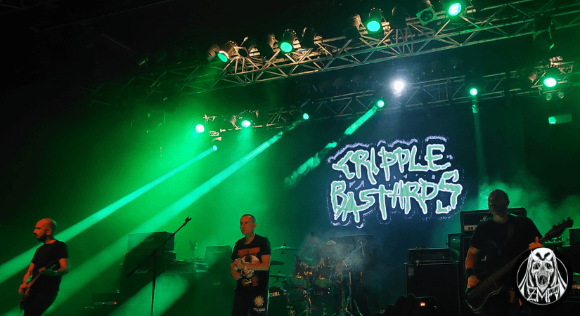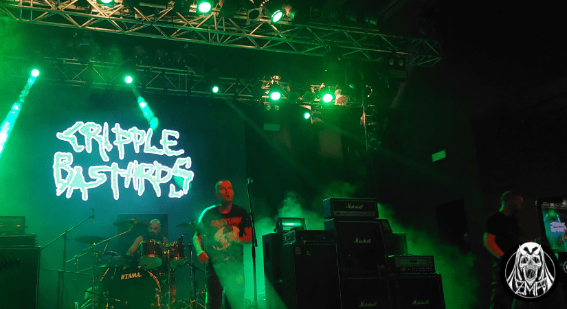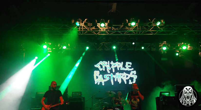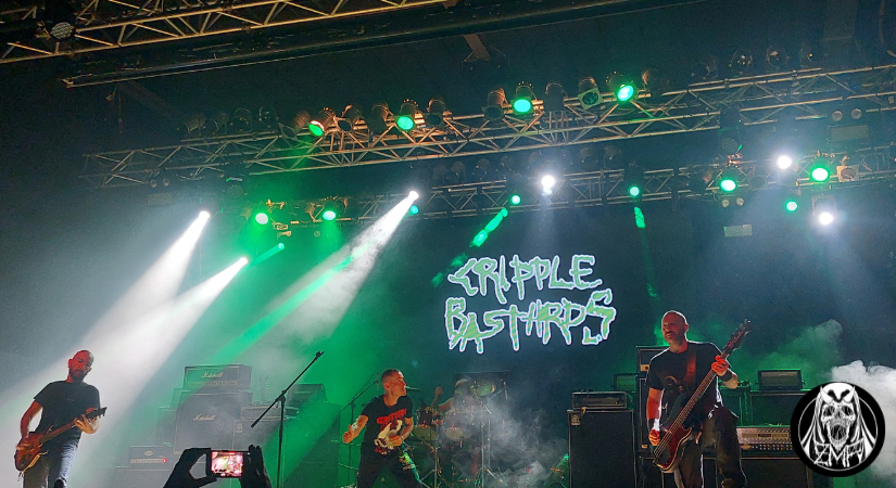 Più si va avanti, più aumenta l’hype. Gli Angelus Apatrida hanno gettato quella benzina sul fuoco che doveva far esplodere la giornata, ma a rincarare la dose, adesso, ci sono i Cripple Bastards. Una band grindcore in una line-up quasi del tutto thrash metal potrebbe inizialmente stonare, ma se l’obiettivo è quello di picchiare duro per incrementare il delirio generale, allora i piemontesi sono i più adatti per realizzarlo. Al posto di Schintu the Wretched, fermato da un’influenza, i grinders prendono in prestito Eugenio Sambasile dagli Embryo presentandosi con una formazione insolita, ma ben assestata. D’altronde, i Cripple Bastards sono sempre gli stessi: si piazzano sul palco, rimangono fissi ai loro posti e scaricano costantemente rabbia e violenza sulla folla ormai travolta dalla furia di Giulio, dalle rasoiate di Der Kommisar e dalle percosse prorompenti di Raphael Saini, che proprio oggi festeggia i 10 anni da batterista della band. Le badilate che rispondono al nome di Polizia, una razza da estinguere e Misantropo a Senso Unico sono solo due di una lunga serie di brani messi nella loro setlist, in uno spettacolo durato un’ora e che ha lasciato i presenti, come al solito, annichiliti.