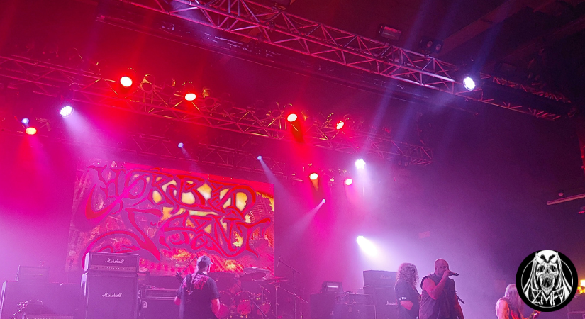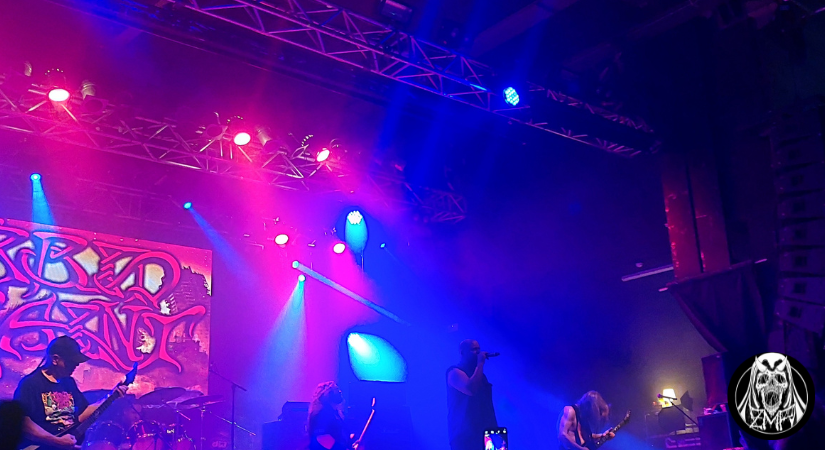 La serata procede di bene in meglio, ma il momento clou ancora non è arrivato. C’è chi, dopo 5 ore, ha già le pile scariche, ma non è il frangente adatto per mollare la presa, perché siamo finalmente arrivati alla parte alta del tabellone. Ad aprirla ci sono i Morbid Saint, altra formazione storica che, come gli Xentrix, è rimasta ferma per anni prima di riprendere la retta via. Sono solo 3 gli album realizzati da inizio anni ’90, di cui il più recente Swallowed by Hell è uscito quest’anno ed è pronto per essere presentato in sede live. In una line-up come quella di oggi, il loro nome potrebbe sembrare il più debole, forse perché meno conosciuti o visti di rado in eventi come questo. Ma chi ha pensato una cosa del genere è stato smentito all’istante. La band del Wisconsin arriva sul palco con grinta, foga e tanta voglia di spaccare tutto, partendo in quinta con la titletrack dell’ultima release. In un attimo, la violenza sonora prende il sopravvento, il moshpit si anima bruscamente e, da qui in poi, parte una vera e propria gara per sopravvivere nel parterre. La prova corale della band è mostruosa: Jay Visser e Jim Fergades impugnano le loro asce scuotendo i muri del locale con i loro riff pesantissimi, con Bob Zabel in stato di grazia al basso. Pat Lind si dimostra un trascinatore nato, sia nelle vocals che per la presa sul pubblico, ma chi merita l’elogio più grande è il batterista DJ Bagemehl, una furia dietro le pelli, che ha lasciato il segno nei timpani di tutti i presenti. Lo spettacolo è così coinvolgente che tra continui circlepit, wall of death e crowdsurfing nessuno rimane deluso e, dopo 75 minuti devastanti chiusi con la storica Damien, i Morbid Saint se ne vanno trionfanti, acclamati da chiunque, consapevoli di aver regalato ai presenti uno show eccezionale, il migliore visto finora.