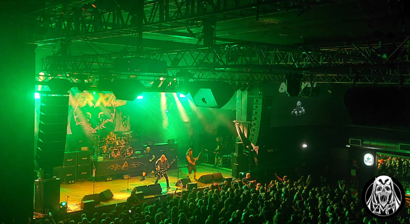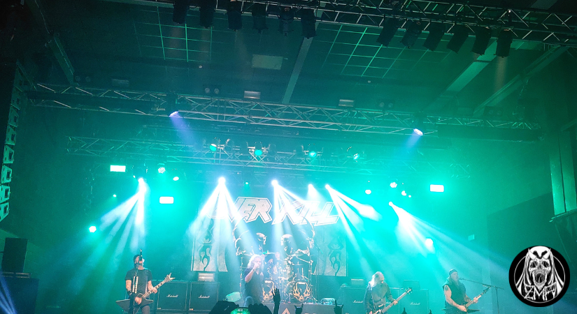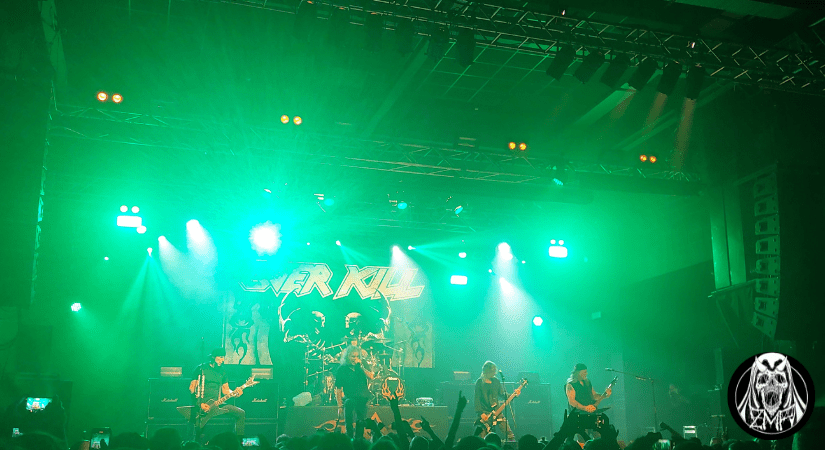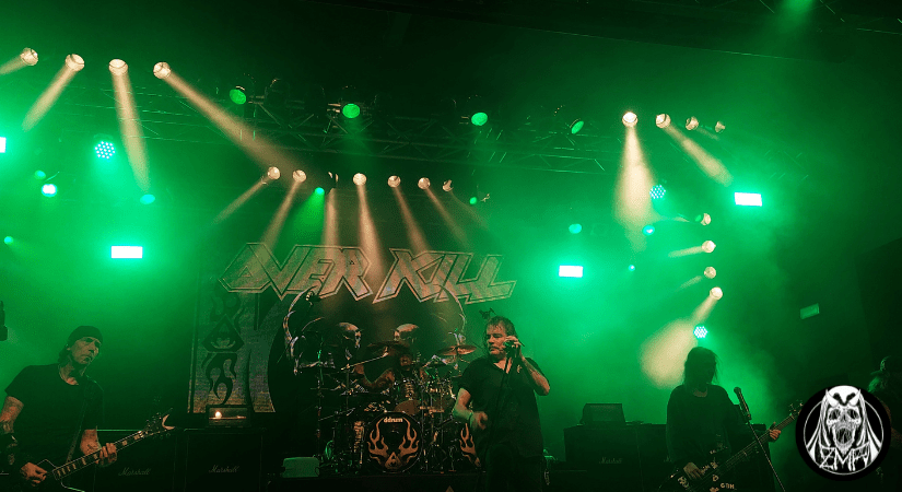 Il tempo è trascorso inesorabile fino alle 23, ora in cui, dopo 30 minuti di pausa per rifocillarsi dalle mazzate prese, il palco si tinge di verde. Segno inequivocabile che stanno arrivando gli Overkill. Come i Cripple Bastards, anche loro accusano un’assenza pesante: quella di D.D. Verni, bloccato da un persistente problema alla spalla. Sul palco, quindi, si presentano con Christian Giesler, già membro dei Kreator dal 1994 al 2019, che lo sostituisce al basso per il tour europeo, compresa la data di oggi. Ma tutto ciò è superfluo se l’intera band gira bene nei suoi ingranaggi, e i thrashers del New Jersey, in risposta alle opinioni contrastanti su di loro, lo dimostrano ogni santa volta. Tra i gruppi thrash metal storici, infatti, pochi possono vantare l’attitudine, la perseveranza e lo stato di forma degli Overkill, che non perdono mai quella grinta mostrata puntualmente in studio e in live, a partire dal frontman. Bobby “Blitz” Ellsworth ha ormai 65 anni e, dopo tutti i problemi di salute che ha avuto, è ancora lì, carismatico e sicuro di sé, sempre pronto a fornire performance da vero leader. Con questo non si tolgono di certo i meriti a Derek Tailer, Dave Linsk o allo stesso Verni, ma gli spettacoli degli Overkill ruotano maggiormente attorno alla sua figura da showman che, anche stasera, non delude. Brani come Hello From the Gutter, Electric Rattlesnake e Mean, Green, Killing Machine sono uno spettacolo non solo per le orecchie, ma anche per gli occhi, perché a vedere una band così ben coordinata ne giovano tutti. Nessuno sbaglia niente, neanche Giesler che, comunque, ha una grande dose di esperienza, e tutto ciò si riversa sullo stato d’animo dei presenti che si scatenano continuamente. Non c’è tempo per fermarsi, ogni canzone diventa una festa, soprattutto i classici Elimination, Horrorscope e Fuck You, durante i quali partono crowdsurfing all’impazzata. Scorre così, quindi, un’ora e mezzo di puro divertimento in uno show dove non è mancato niente, degna conclusione di una giornata memorabile.