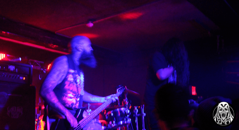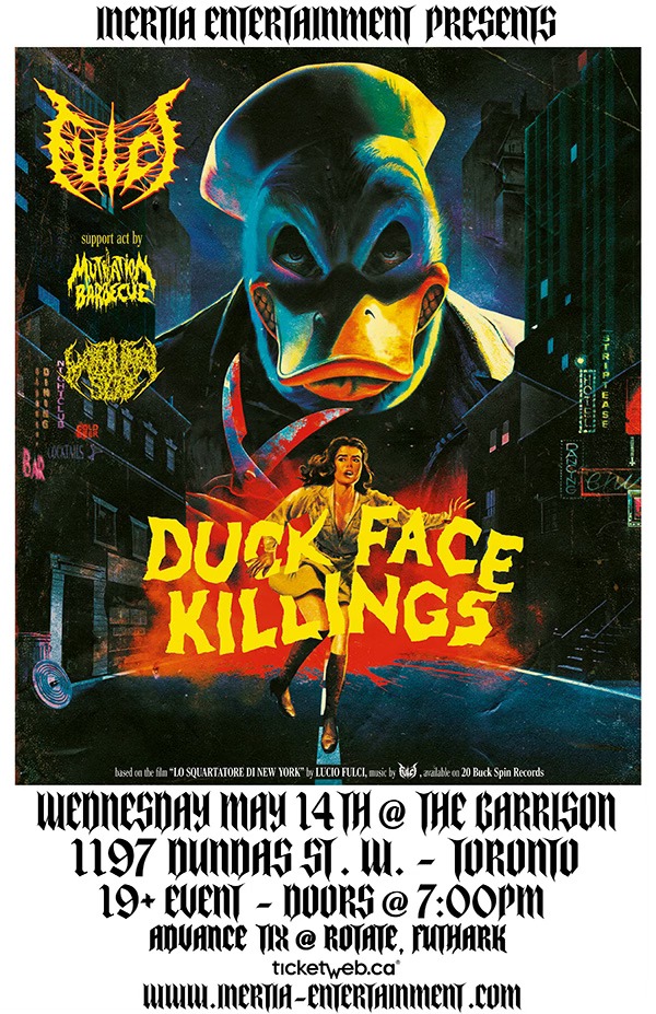 Eccolo, finalmente, il momento più atteso della serata. Sin dall’inizio, la fila per il merchandising dei Fulci divideva in due il locale per la sua lunghezza, segno inequivocabile che tutti, ma proprio tutti, li aspettavano. E il motivo è già stato detto: molti dei presenti non avevano ancora assistito ad un loro concerto, in cui anche la componente visiva gioca un ruolo importante. Le scene tratte dai film di quel regista tanto caro ai ragazzi sono parte integrante dei loro spettacoli, rendendoli non solo perfettamente scenici, ma anche completi nel concept che ruota attorno alla band, stimolando una full immersion nelle trame horror che raccontano in ogni album. È questa la caratteristica che rende ogni loro show un’esperienza completa ed inedita, la stessa che i Fulci vogliono far vivere al pubblico di Toronto con l’ultimo album Duck Face Killings, promosso durante il tour ed ispirato al film lo Squartatore di New York. Lo show si apre infatti con le clip cruente e orrorifiche del lungometraggio, finché entrano in scena i ragazzi acclamati da tutto il locale. Rotten Apple e Human Scalp Collection sono i brani che, non a caso, iniziano a scuotere il Garrison da cima a fondo, soprattutto grazie alla prova di ogni componente. Fiore è l’unico che manca, complici gli imprevisti dell’ultimo minuto, ma il cantante che lo sostituisce non delude, soprattutto nelle bordate tratte da Tropical Sun come Matul Tribal Cult e Apocalypse Zombie, immancabili nella loro setlist. La compostezza di Dome, Klem e Ando Ferraiuolo sul palco è perfetta: non sbagliano niente, viaggiano all’unisono e non perdono mai d’intensità nei loro strumenti, compreso il batterista Edoardo Nicoloso, ormai diventato il perno ritmico della band. La setlist continua a viaggiare sull’ultimo album in studio con pezzi come Maniac Unleashed e Morbid Lust, ma non mancano neanche altre perle di Exhumed Information e Opening the Hell Gates, sulle cui note i presenti non si fermano un attimo nell’incitare i ragazzi da sotto il palco. Tra moshpit e acclamazioni generali, il tempo scorre veloce e sembra che, dopo A Blade in the Dark, il concerto sia finito: i ragazzi si ritirano nel backstage, ma il pubblico li incita a gran voce, vuole ancora scatenarsi. E così, dopo qualche minuto di attesa, ecco che tornano sul palco per chiudere la serata con un encore ricco e epico grazie a bordate come Tomb, Eye Full of Maggots, Lo Squartatore e Stabbed Gutted and Loved. Nessuno è rimasto insoddisfatto, nessuno è rimasto deluso: i Fulci conquistano Toronto al termine di uno spettacolo indimenticabile.