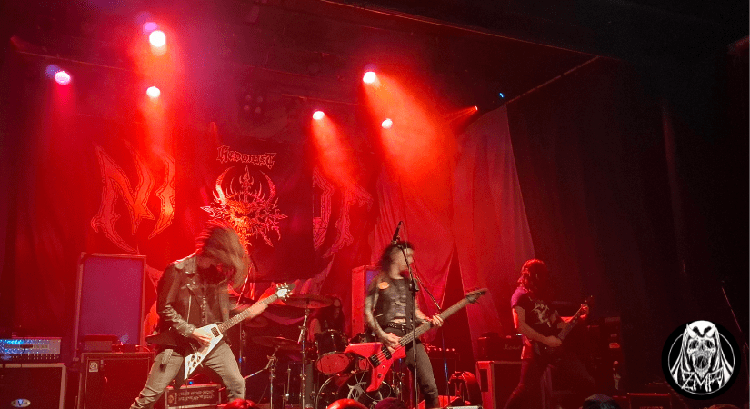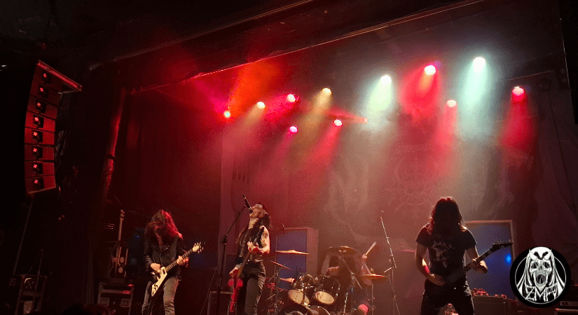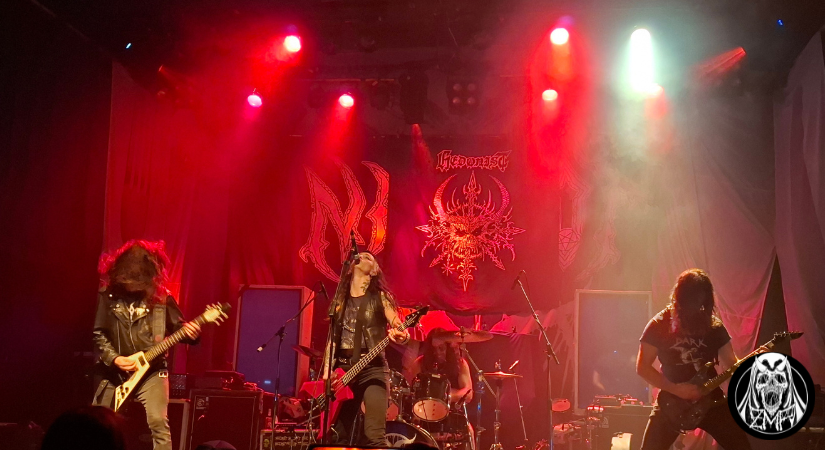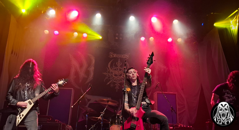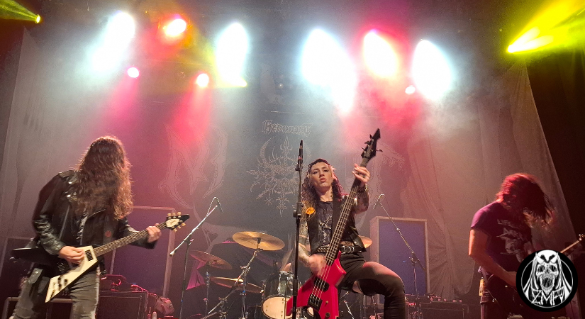 Ad aprire le danze ci sono gli Hedonist, giovane formazione di Vancouver che ha il compito di fare gli onori di casa in tutti i sensi. Sono l’unica band canadese della serata e, davanti al loro pubblico, non hanno la minima intenzione di esibirsi con una performance sottotono. Di fatti, il quartetto sale sul palco carichissimo, con la frontwoman Athena che carica il pubblico a suon di growling poderosi, con la risposta calorosa degli astanti. Come da copione, il loro show dura poco, ma è distruttivo e convincente, dando il giusto incipit alla serata.