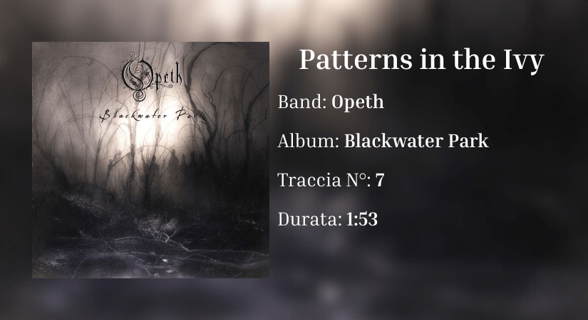 Con gli Opeth, il discorso cambia decisamente. Nelle loro opere, si trovano tracce lunghe in cui si alternano sezioni di death metal intenso e altre più melodiche ed introspettive che, prese singolarmente, sarebbero perfetti intermezzi strumentali. In Blackwater Park, le sezioni senza cantato di Dirge for November o della title-track rispecchiano queste caratteristiche, ma il buon Mikael Åkerfeldt ha deciso di piazzare un brano a sé stante che, proprio come breve interludio, funziona benissimo: Patterns in the Ivy. La traccia ruota attorno a un arpeggio in tonalità minore che alterna accordi aperti e dissonanze leggere. Non ci sono percussioni, né voce: tutto si regge sull’equilibrio fra vuoto e risonanza, con l’ingresso del pianoforte verso la fine che crea una carica emotiva costante fino al finale criptico. Un attimo di pura introspezione che, posta tra due tracce dalle forti sfuriate (The Funeral Portrait e Blackwater Park), rappresenta un respiro di pura quiete e riflessione.