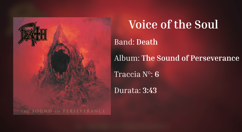 Voice of the Soul è senza dubbio il brano più conosciuto di tutti in questa categoria, non solo per essere uno dei pochissimi pezzi strumentali dei Death, ma anche per la sua sinfonia. Ogni disco della band di Chuck Schuldiner è a suo modo un capolavoro, e The Sound of Perseverance è quello dalle più ampie vedute, l’album che ormai mostrava tutto, tranne il death metal puro degli esordi. E soprattutto in questo brano, il cambiamento si nota a dismisura: non c’è batteria, non c’è il growl tagliente che caratterizza l’album, ma solo due chitarre che duettano in un intreccio di arpeggi e melodie in costante equilibrio, creando contrasti morbidi e una forte intensità emotiva. La chitarra solista emerge gradualmente, senza mai essere troppo virtuosa, riuscendo a non prevalere su quella acustica che, da buona base, la sostiene e la segue in ogni attimo fino al finale, in cui si spengono entrambe quasi allo stesso modo. In un album pieno di tracce tecniche, precise, variegate e potenti nell’impostazione, Voice of the Soul si distingue nettamente, mostrando un lato che, fino ad allora, nell’identità dei Death, si era soltanto intravisto.